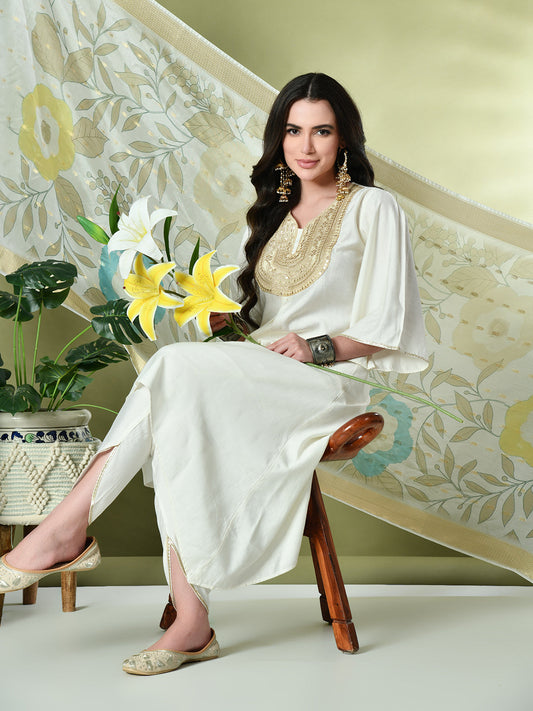 Myshka Women's White Viscose Silk Embroidered Kurta & Palazzos Set