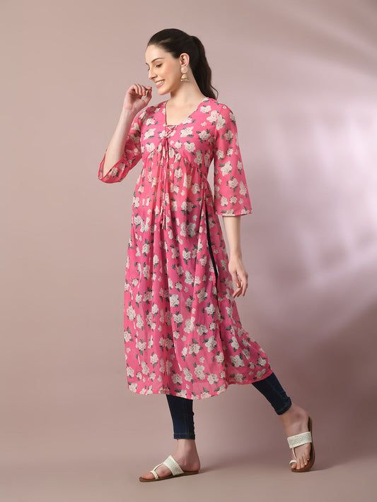Myshka Women's Pink Printed Georgette A-Line Nyra-Cut Kurta