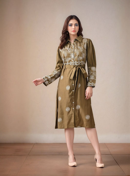 Myshka Women Olive Green Embroidered Shirt Dress Trendy Full Sleeves