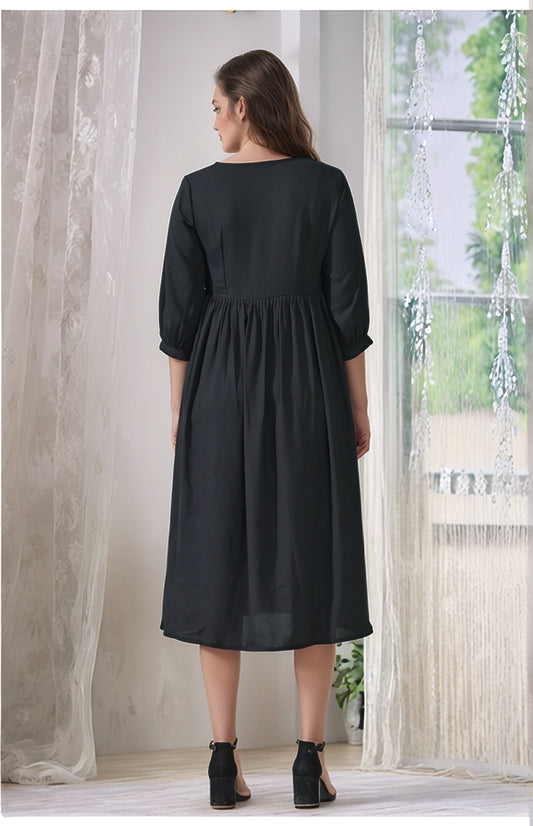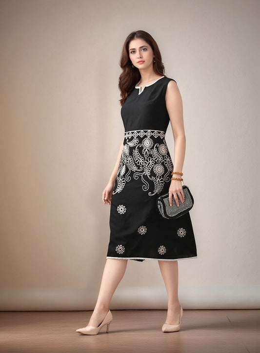 Myshka Women Flared Knee Length Embroidered Black Dress