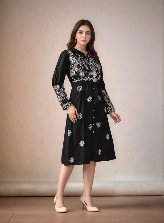 Myshka Women Black Embroidered Shirt Dress Trendy Full Sleeves