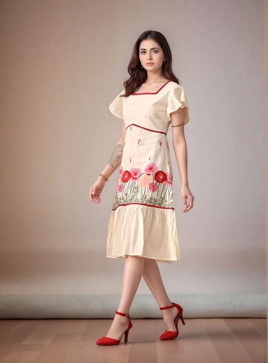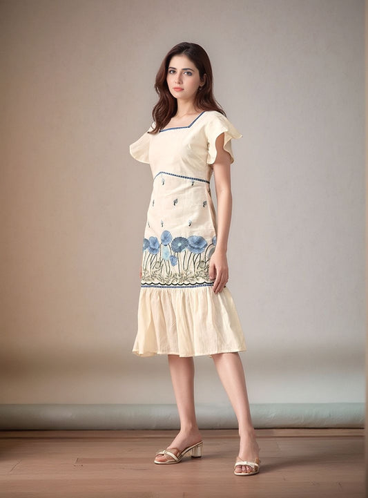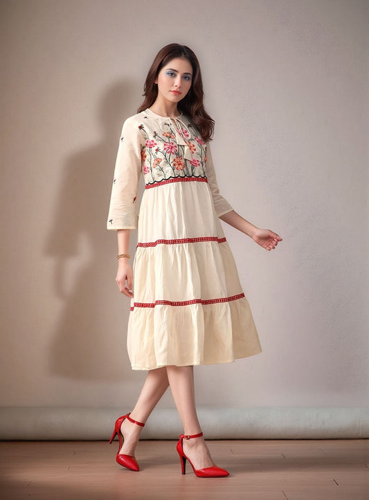 Myshka Women Multi Color Thread Embroidered Laced Tired Dress Regular Sleeves