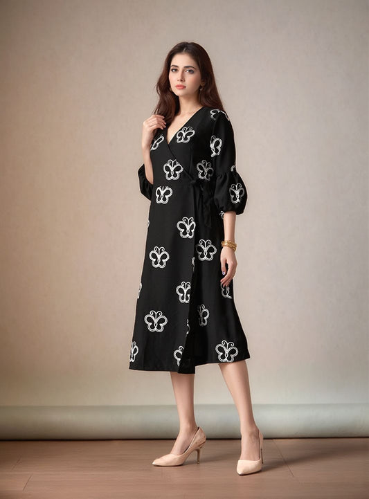Myshka Women Black Embroidered Wrap Dress Trendy Sleeves