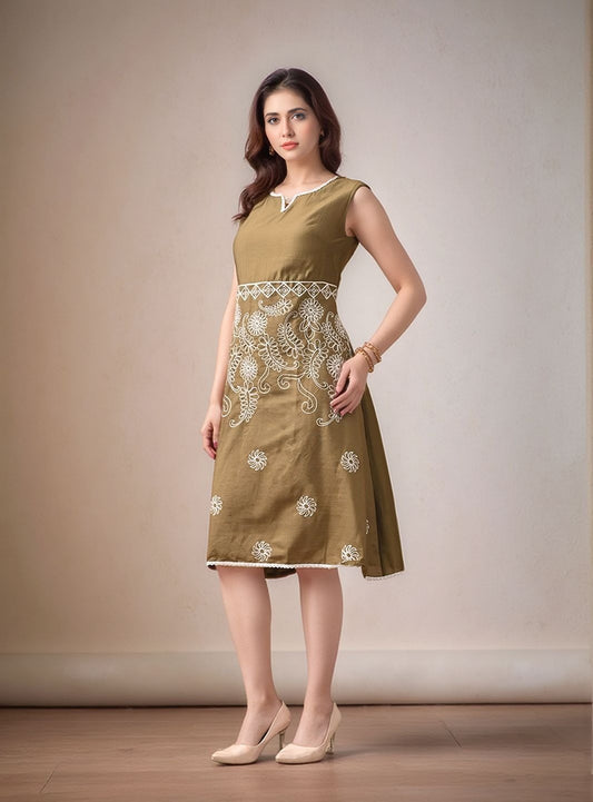Myshka Women Olive Green Embroidered Dress Sleeveless