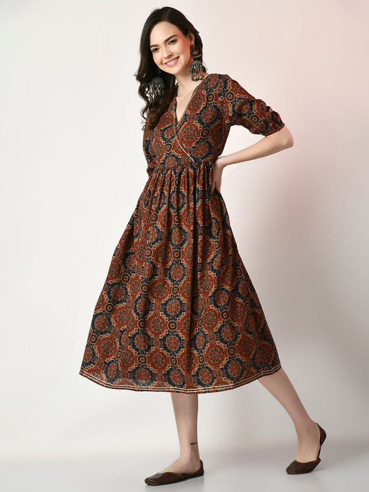 Myshka Women's Rust Printed Cotton Party Dress Myshka