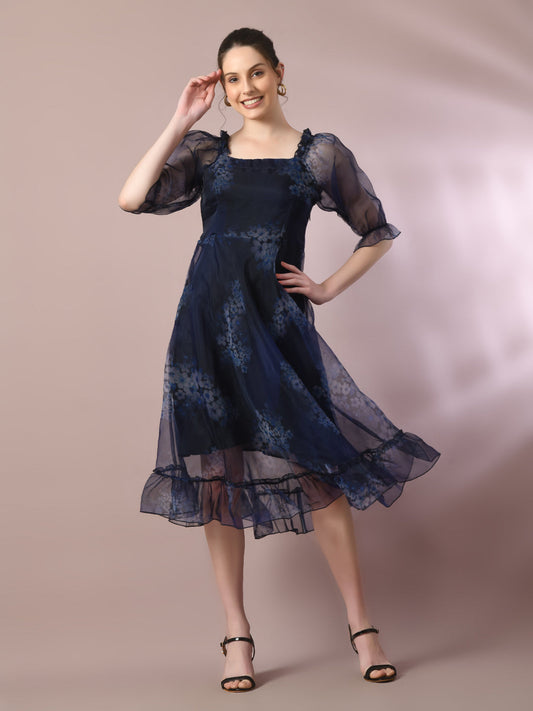 Myshka Women's Navy Blue Printed Square Neck Fit And Flare Party Dress