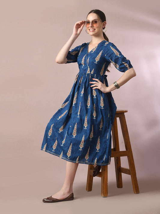Myshka Women's Blue Printed Cotton V-Neck Empire Party Dress