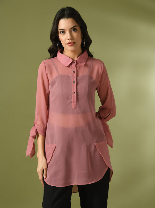 Myshka Women's Pink Solid Georgette Longline Party Sheer Tunic