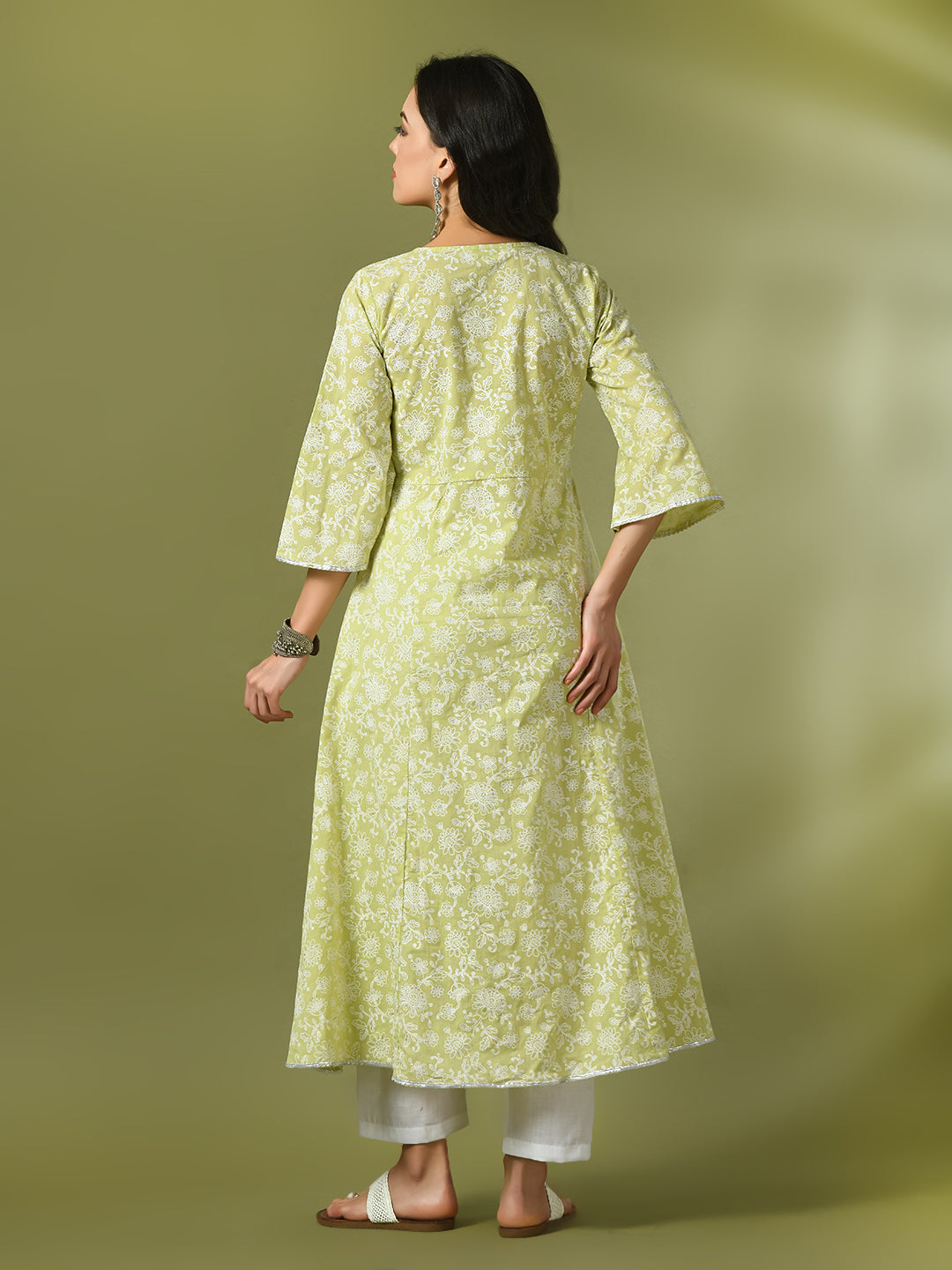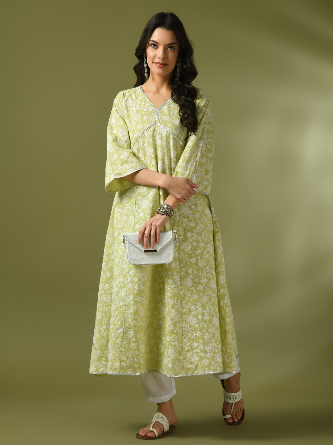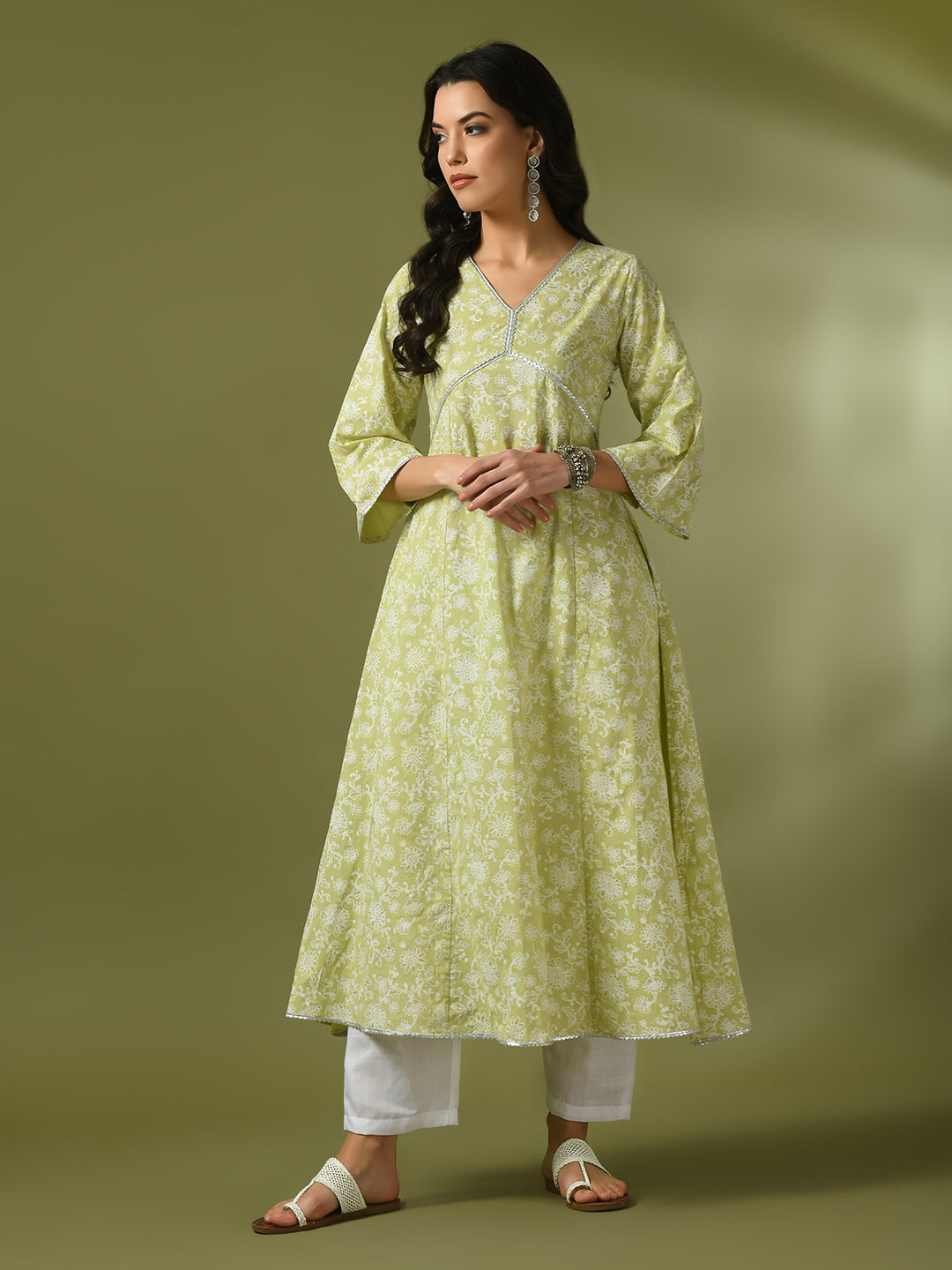 Myshka Women's Lime Green Printed Cotton Anarkali Party Kurta Sets
