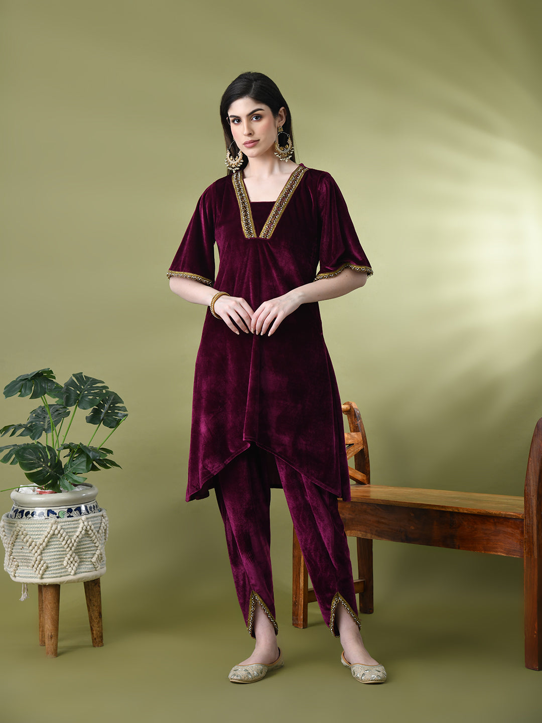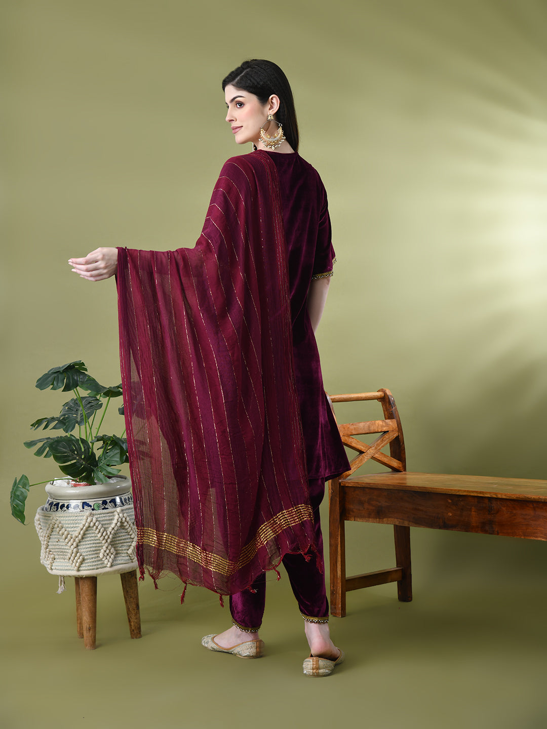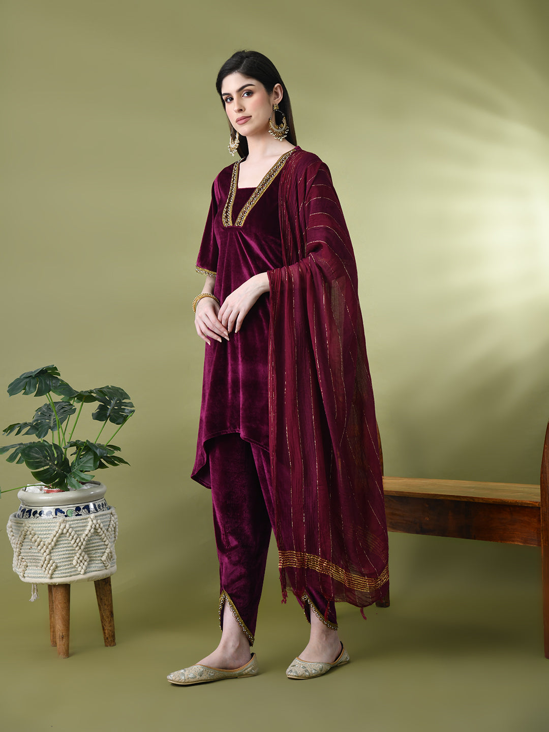 Myshka Women's Magenta Velvet Kurta Pant With Dupatta Set
